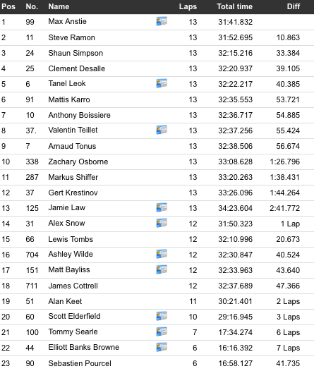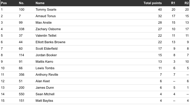 Jamie Collins went 24th and 21st but no overall placing as points only counted to 18th.
