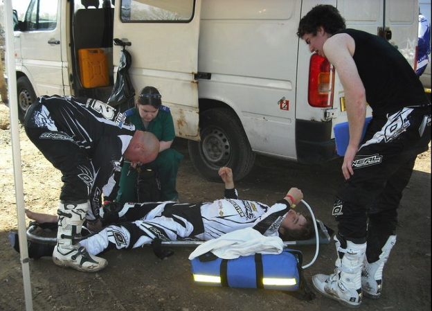 Bjarne 'on the gas' assisted by a Paramedic and Team Manager and Coach Jason Morris. At right is fellow team rider John Phillips.