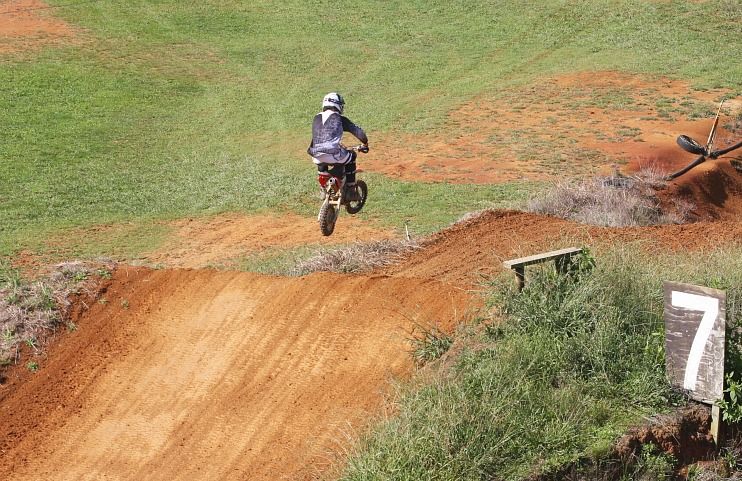 Pitbike exponent John Nelson is usually found on the Mini track but was given the opportunity to try the jumps on his Honda. The photo does not really show it but No.7 is a big downhill and he attacked it without lifting off. Heart stopping stuff. Two laps and he was shattered - no wonder !!